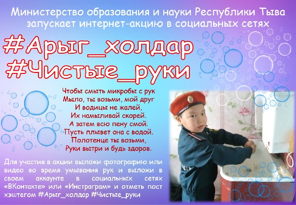 Дорогие ребята, уважаемые взрослые! Министерство образования и науки Республики Тыва приглашает Вас принять участие в интернет-акции #Арыгхолдар #Чистыеруки в социальных сетях. Главная цель акции — привить внимание к правильному мытью рук, ведь это самый эффективный профилактический способ защитить себя от заболеваний. Эксперты напоминают, что в мировом масштабе проблема немытых рук имеет катастрофические последствия. Через немытые руки в организм человека попадают возбудители гриппа, ОРВИ, а также холеры, дифтерии, гепатита и многих других опасных заболеваний. Процедура мытья рук с мылом помогает удалить с поверхности кожи до 90% микроорганизмов и позволяет значительно снизить вероятность передачи возбудителей кишечных инфекций. Специалисты в области гигиены в соответствии с рекомендациями ВОЗ предлагают мыть руки с мылом, уделяя внимание коже между пальцев и под ногтями, не менее 15 секунд и смывать мыло в проточной воде. Высушите руки лучше всего бумажным полотенцем, закрывая кран так же бумажным полотенцем, т. к. перед мытьем его всегда касаются грязными руками. Выбрасывать бумажное полотенце нужно в мусорное ведро. Таким образом, такая простая гигиеническая процедура, как обычное мытье рук, не только помогает предупредить заражение организма вредоносными вирусами и инфекциями, но и делает нашу жизнь более комфортной, приятной и безопасной. Для участия в акции необходимо выложить фотографию или видео во время процесса умывания рук и выложить в личном аккаунте в социальных сетях «ВКонтакте» или «Инстраграм» и отметь пост хэштегом #Арыгхолдар #Чистыеруки.
